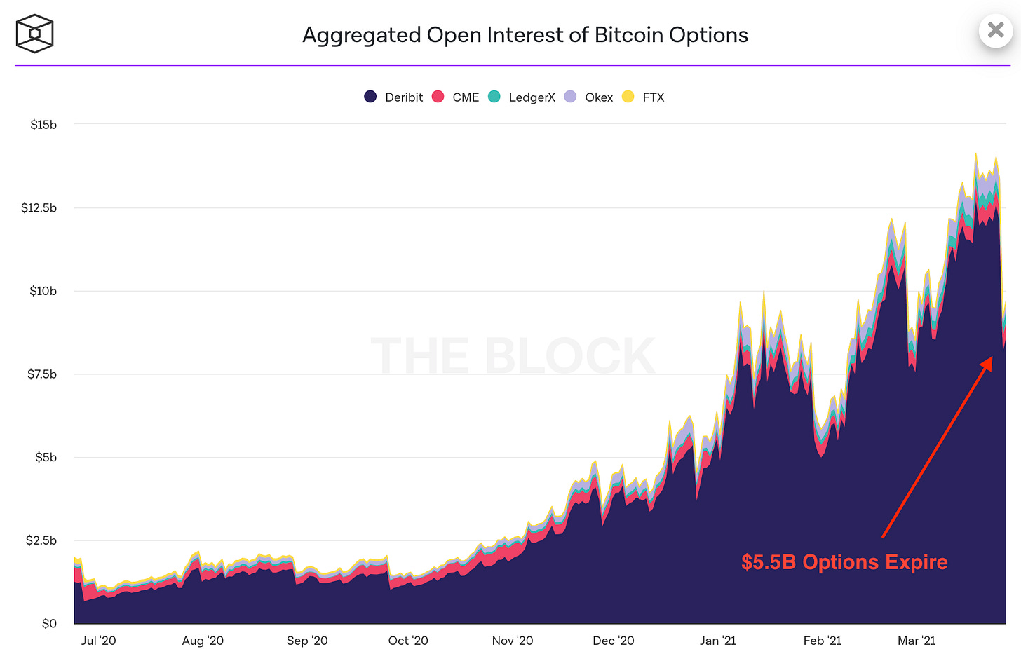 The collective tug-of-war between all options drags the underlying asset towards a price where the maximum number of options expire worthless - a pattern somewhat melodramatically known as the theory of maximum pain. So the record ~$5.5B of options that closed on Friday were accompanied by a correspondingly large drag on the price towards the point of maximum pain - which for the options expiring on Friday was ~$40k.