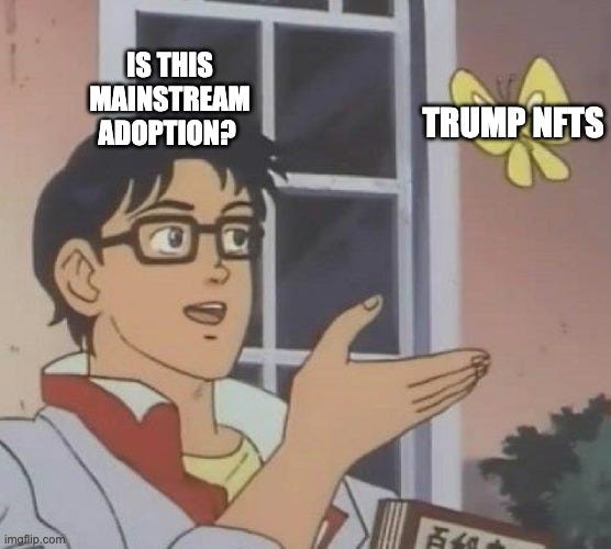 I suppose I am obligated to mention that Donald Trump released a suite of apocalyptically ugly NFTs. The tokens feature art that was stolen from Google image search and a series of prizes like dinner with Trump in Miami or ten minutes of zoom time. The only catch? Almost every prize can be replaced with another NFT if Trump doesn’t feel like delivering. Also the TOS link is a 404. Obviously the collection raised ~$4.4M in 24 hours and is currently trading above the mint price. This is the hell we have built for ourselves.