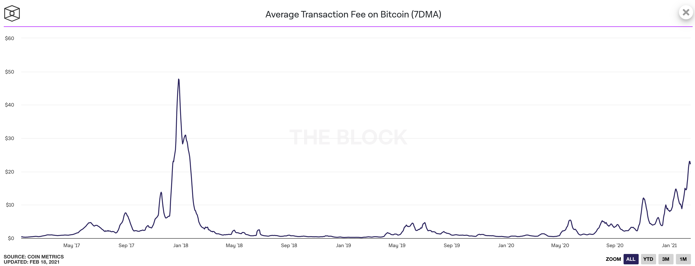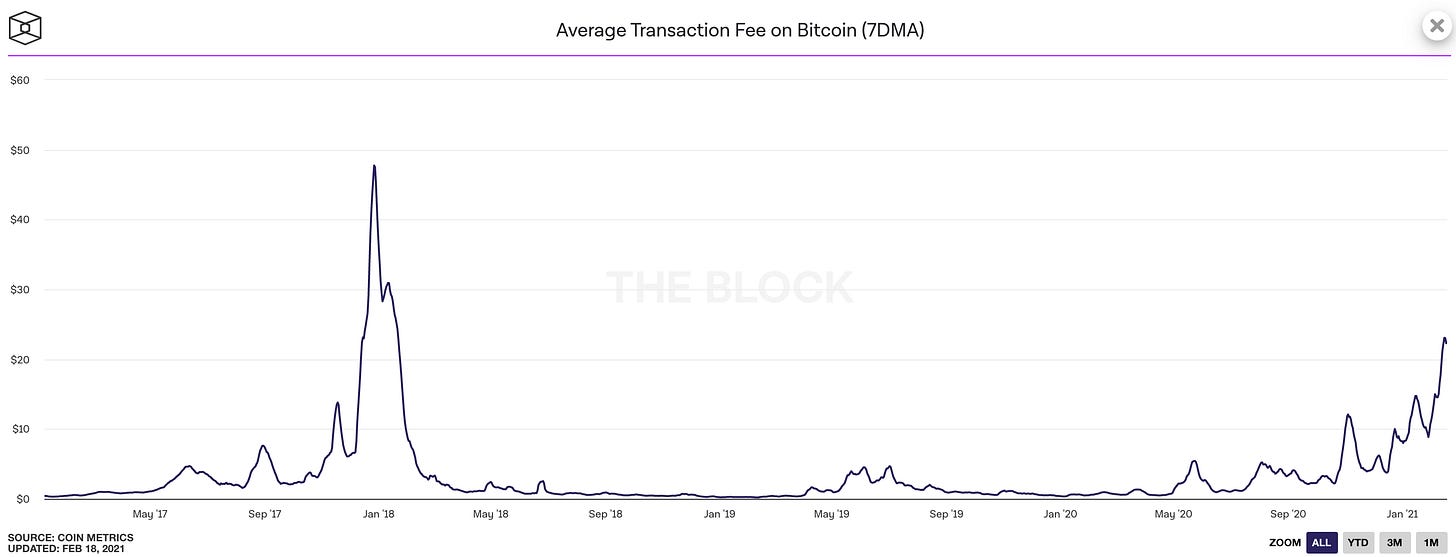 Obviously this is expensive (and therefore painful) for Ethereum users, so there is lots of frustration. Bitcoin fees have also been rising lately, although they have not yet reached the peak of the 2017 frenzy.