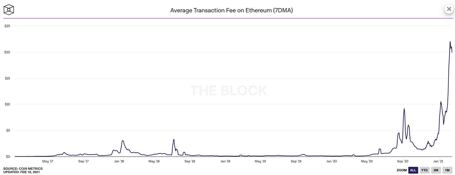 Ethereum’s transaction fees (already at all time highs) have continued to climb steeply. At time of writing they are averaging ~$20/transaction, with more complex transactions like the ones used in DeFi projects costing hundreds of dollars.