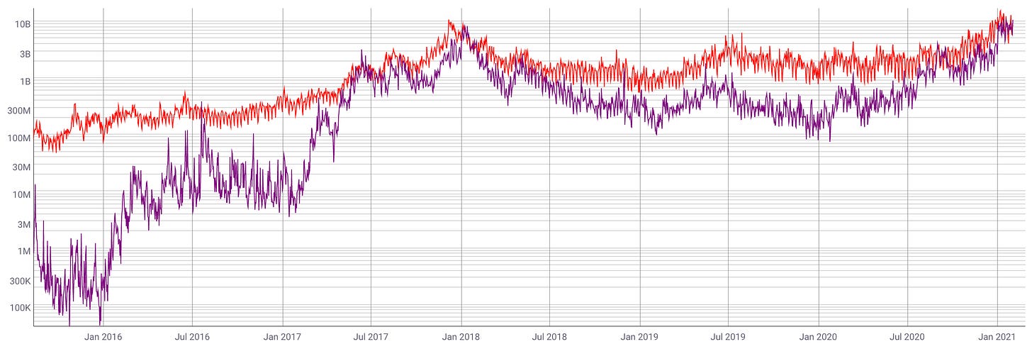 Ethereum’s transaction volume is also growing rapidly - occasionally you will hear claims that Ethereum’s transaction volume is larger than Bitcoin’s but to make that claim they need to include some subset of the transaction volumes of networks built on top of Ethereum and not just Ethereum itself. It’s true those networks provide material value to the Ethereum ecosystem, but they also can (and sometimes do) migrate to other competing networks so I don’t think it’s an apples-to-apples comparison. Still even at the base layer Ethereum is now clearing as much daily value as the Bitcoin network is: