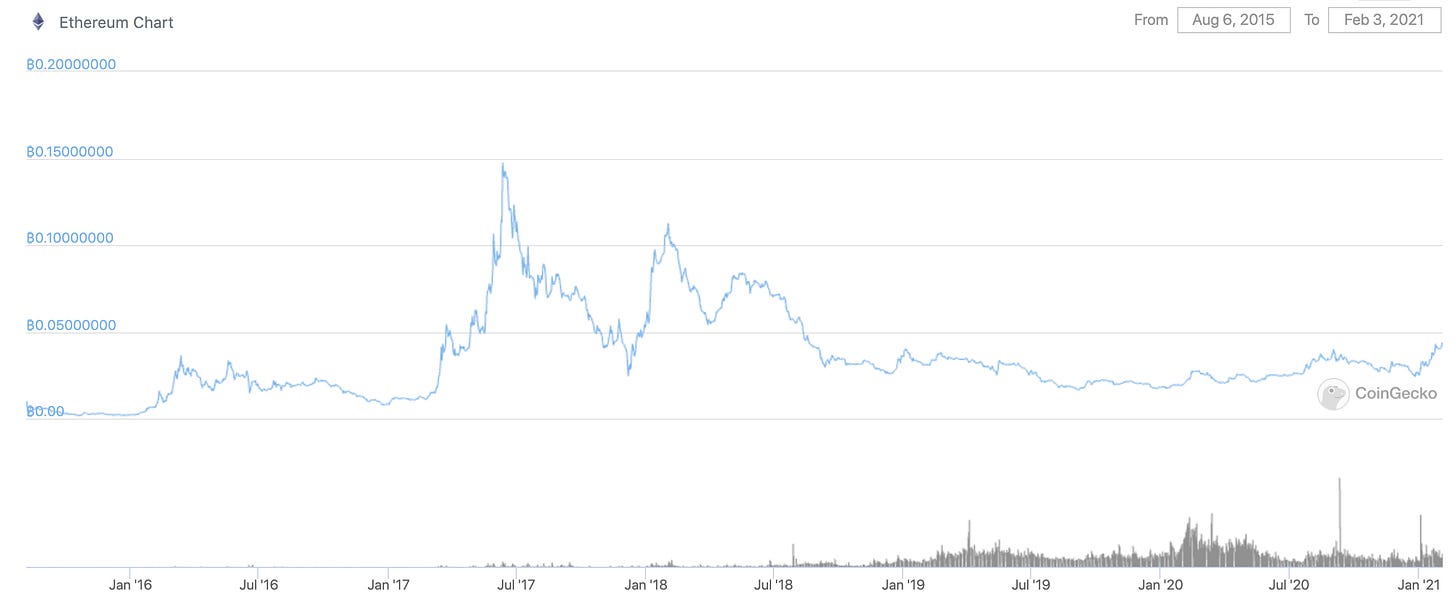 Still it is worth watching the BTC/ETH chart to separate out the market’s excitement for cryptocurrency generally from their excitement about Ethereum specifically. By that metric things have ticked up for Ethereum but are still far from the all time high during the height of the 2017 bubble.