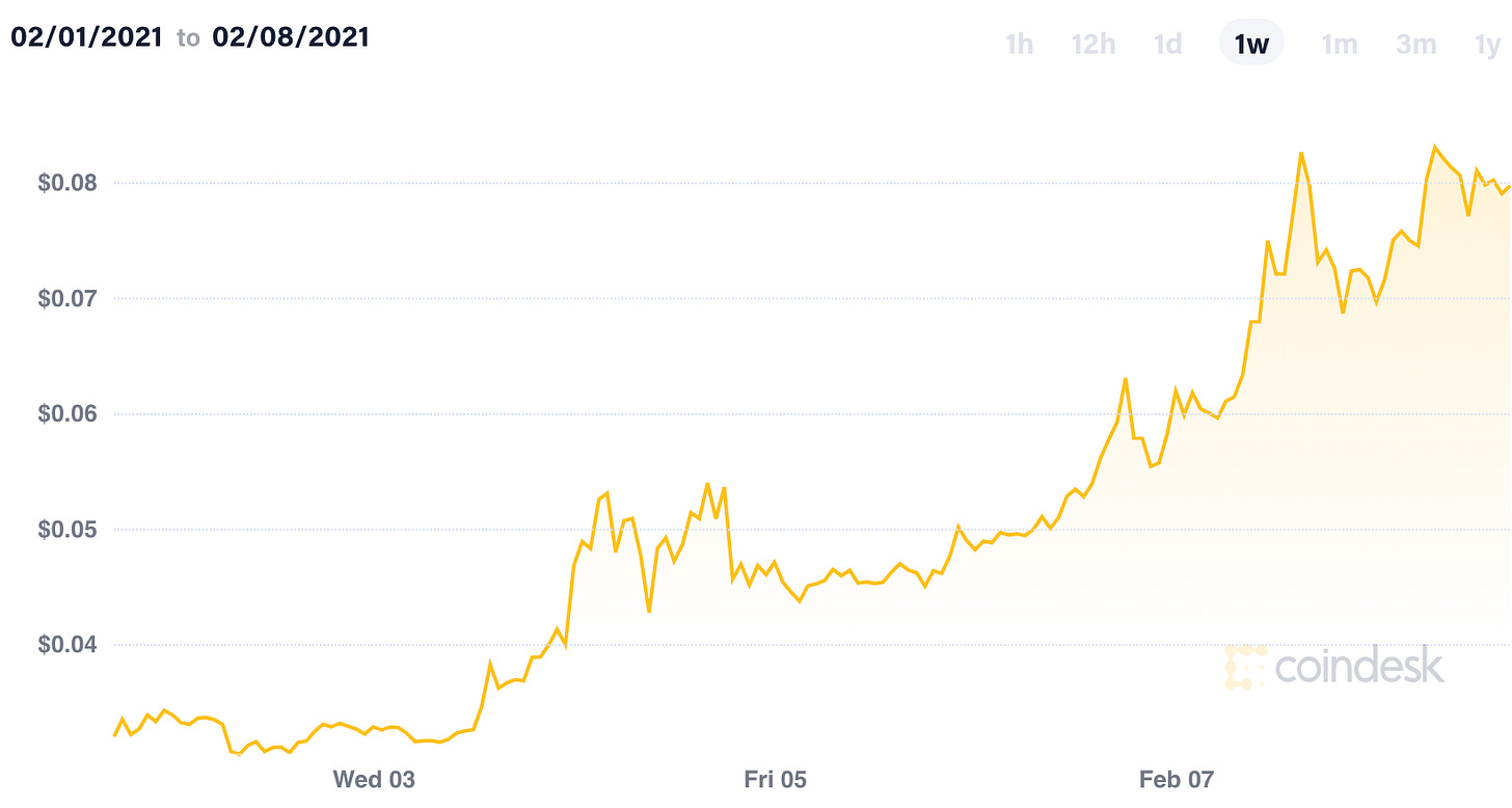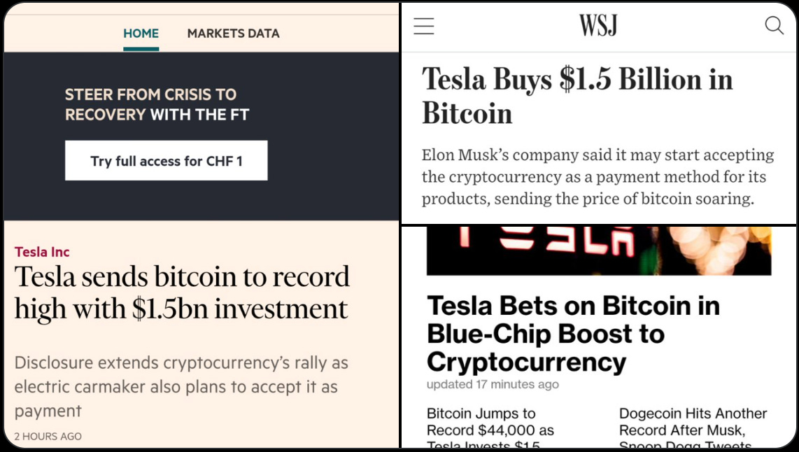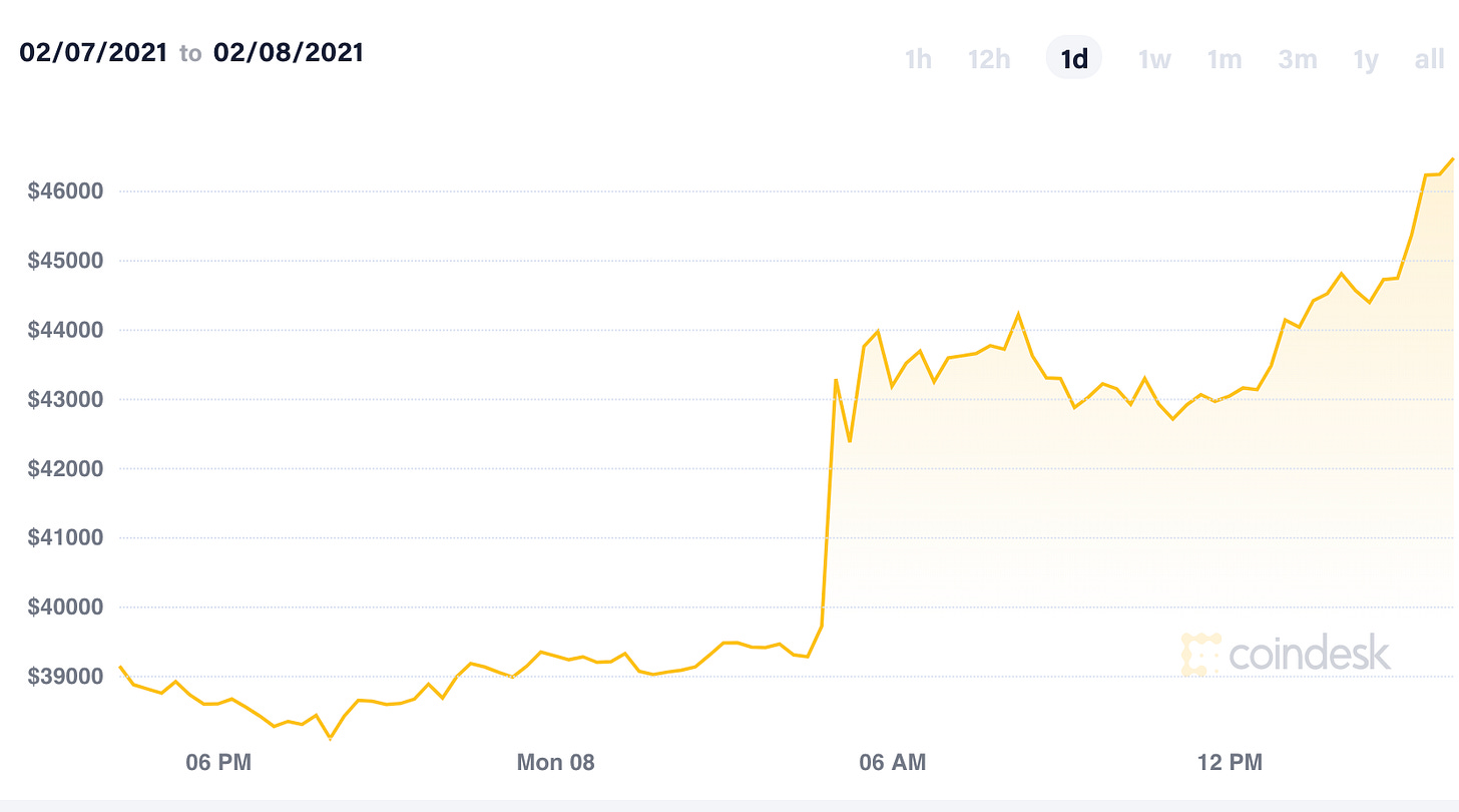 This is actually a big deal - not just because $1.5B is a pretty enormous market buy but because Tesla taking this step has drastically lowered the career risk for any other companies or financial managers who had been contemplating a similar strategy. Yesterday investing ~10% of your company’s treasury into Bitcoin was madness! Today it is the kind of cutting edge capital strategy employed by the world’s richest man and one of the world’s most valuable businesses.