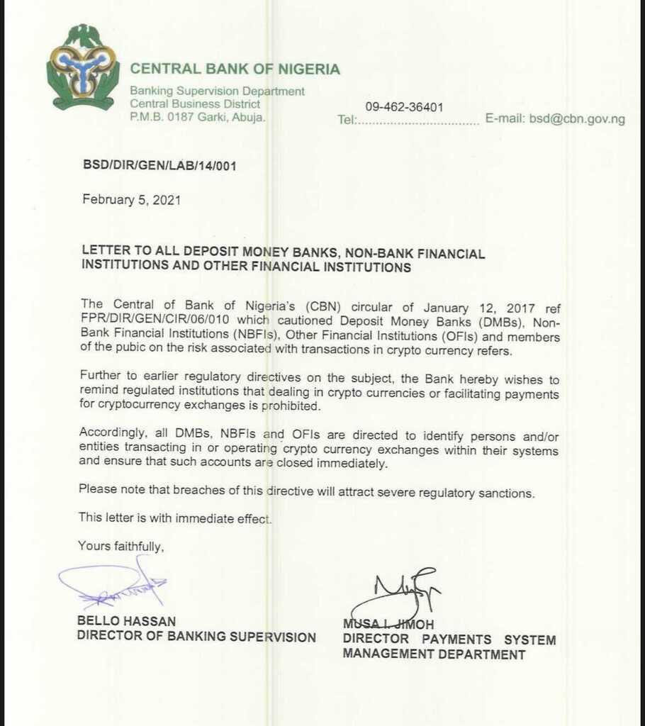 The Central Bank of Nigeria has formally banned Bitcoin since 2017. Cryptocurrency exchanges are forbidden in Nigeria and Nigerian banks are not allowed to facilitate payments to or from cryptocurrency exchanges outside the country. On Feb 5th they sent a letter reaffirming this stance that caused some news outlets to report that Bitcoin had been newly banned. In reality nothing had actually changed.