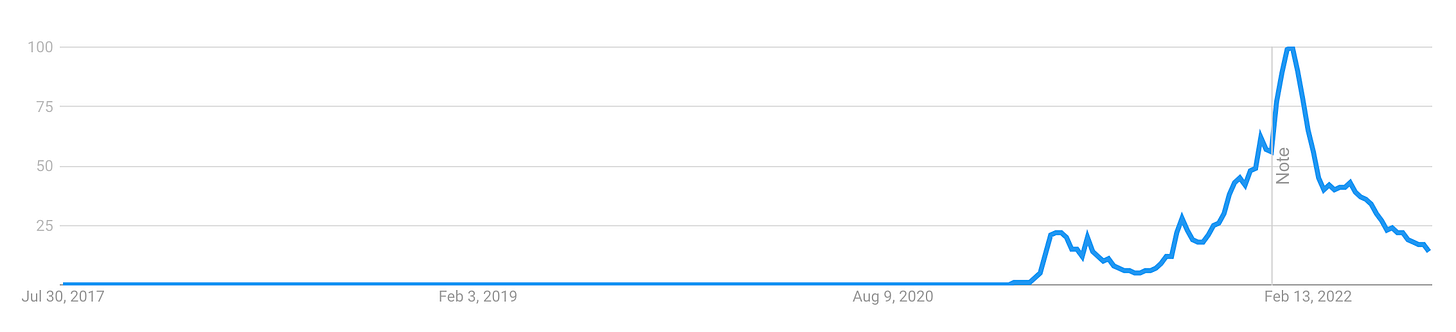 Following the enormous peak in May of this year (the Otherside land sale) NFT trading volume off an absolute cliff. At peak in August of last year there were more than >$1B worth of NFTs traded in a single week. Even after that bubble was over the majority of the year saw weekly trading volumes around ~$400-800M. In the second half of May and beyond volumes have been dramatically lower, with last week being the lowest total trade volume (~$75M) since February 2021. According to Google Trends mainstream interest in NFTs peaked in January and has fallen since: