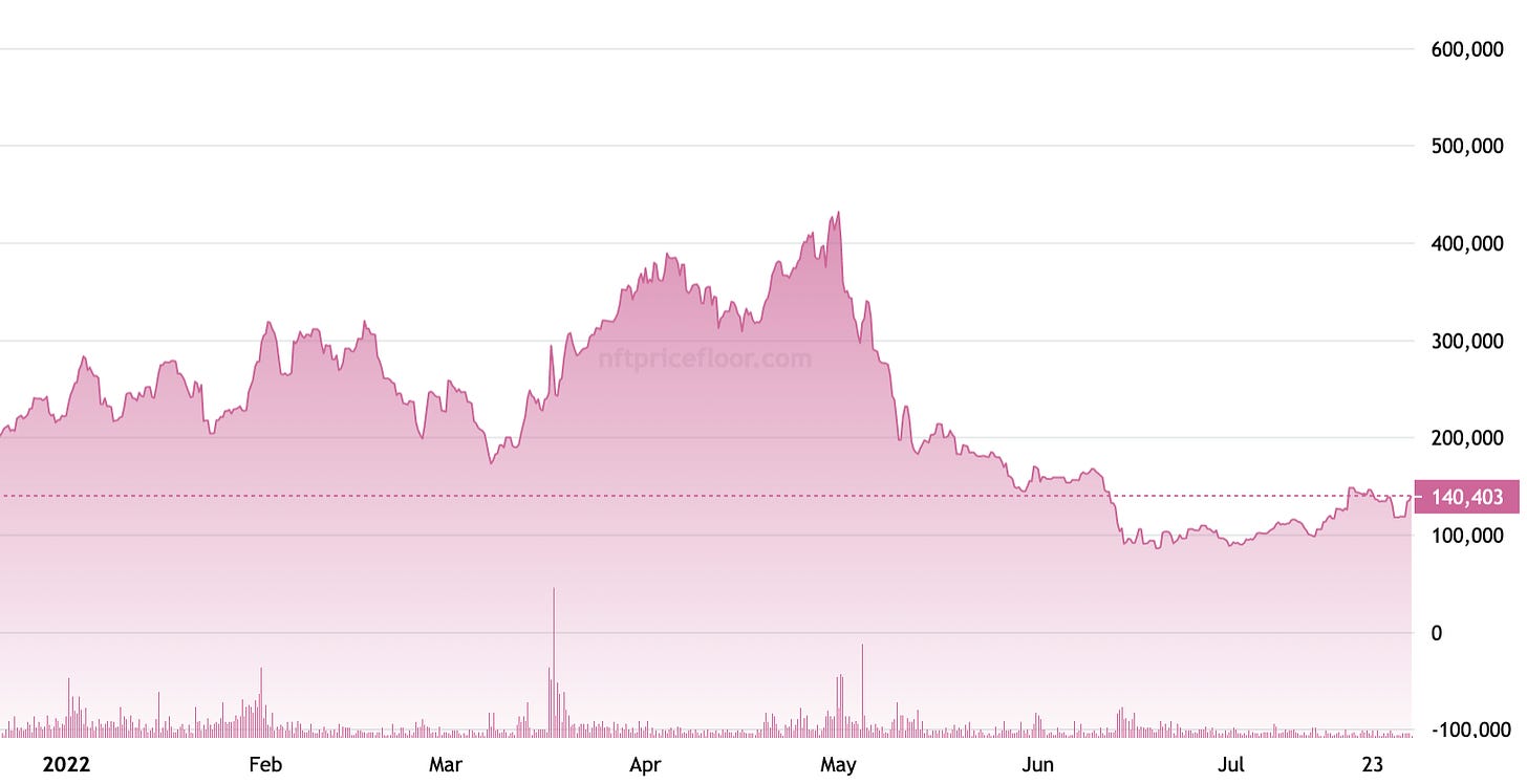 First, prices have fallen a lot less precipitously than volume and search interest, at least among the expensive, high-profile collections. The price of Bored Apes for example peaked at $400k just before the Otherside mint but stabilized after the initial drop and have not been continuing to fall. You can tell a similar story with most of the other major collections: fewer buyers, but stubborn sellers.
