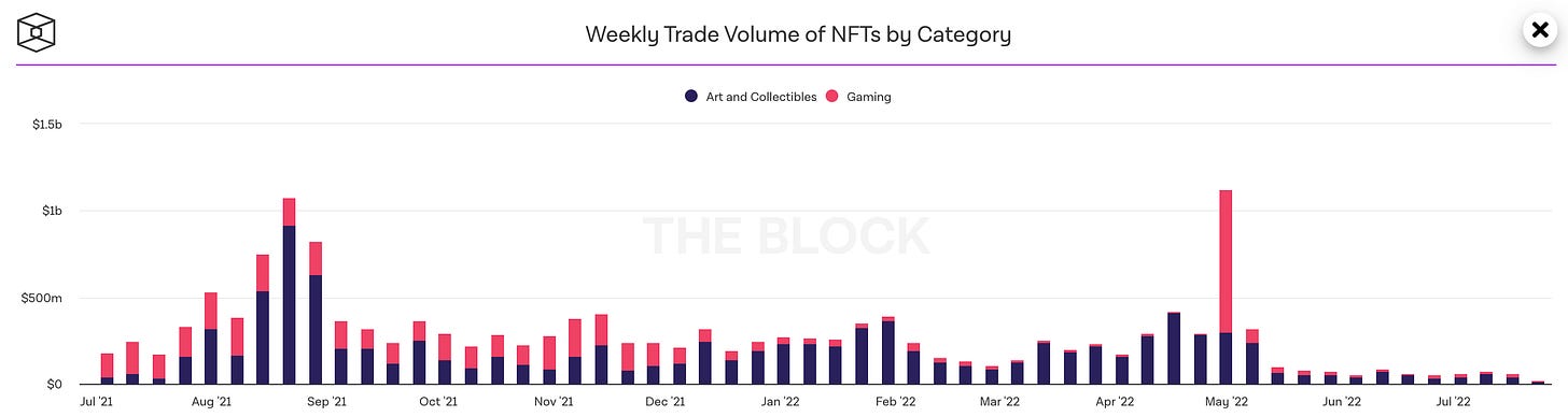Taking into account the feedback from the last reader survey, I’m trying a new format where I bundle specific topics like NFT news or market analyses into dedicated posts so people can read or skip them as they like. By definition those posts will probably have a lower open rate (since some readers will just skip them entirely) so I’ll be looking for other signals to understand if they are useful/interesting! If you like this format/approach, let me know or better yet share this post with a friend or two! 🙂