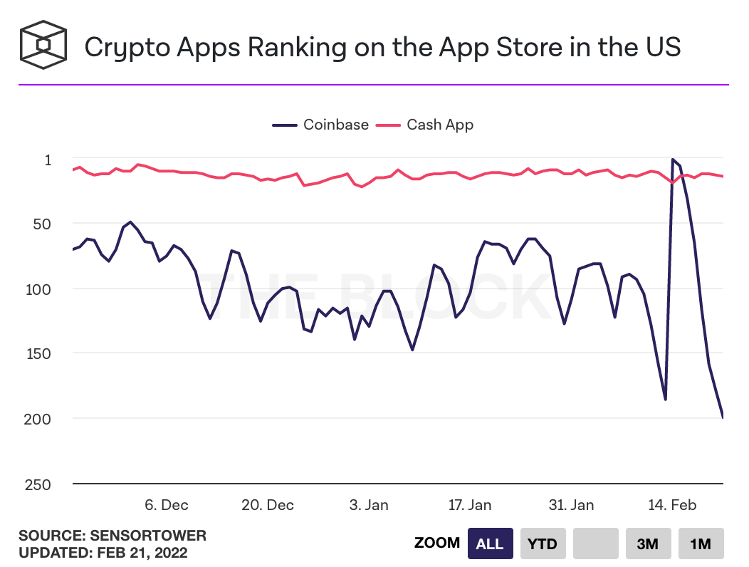 Coinbase’s Super Bowl ad definitely rocketed them to the top of the app store but it does not appear to have had lasting impact. As soon as the $15 new user promotion ran out they plummeted back down to ~200, lower than they were ranked before they started the promotion. Whoopsie-doodle.