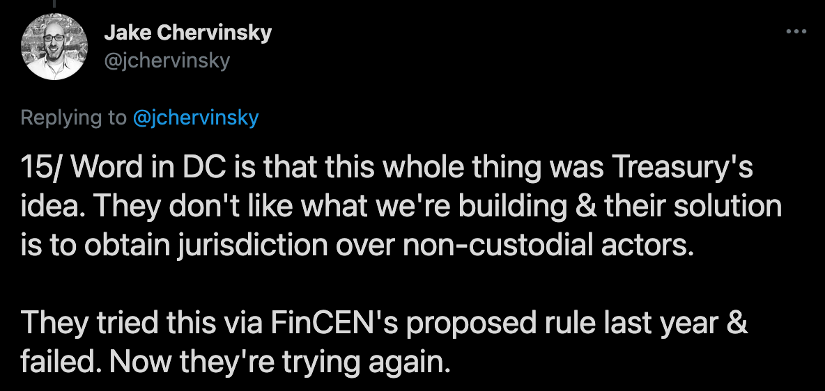 I’ve made no secret of my distaste for proof-of-stake but I don’t think it is productive or useful to outlaw it. Exempting only proof-of-work miners also leaves out software developers, DeFi aggregators and anyone running a Lightning Node - all non-custodial services who literally cannot comply with the law. The government shouldn’t be picking technological winners and losers with legislation - both because it is wrong and because they are genuinely bad at it.