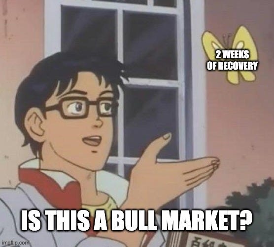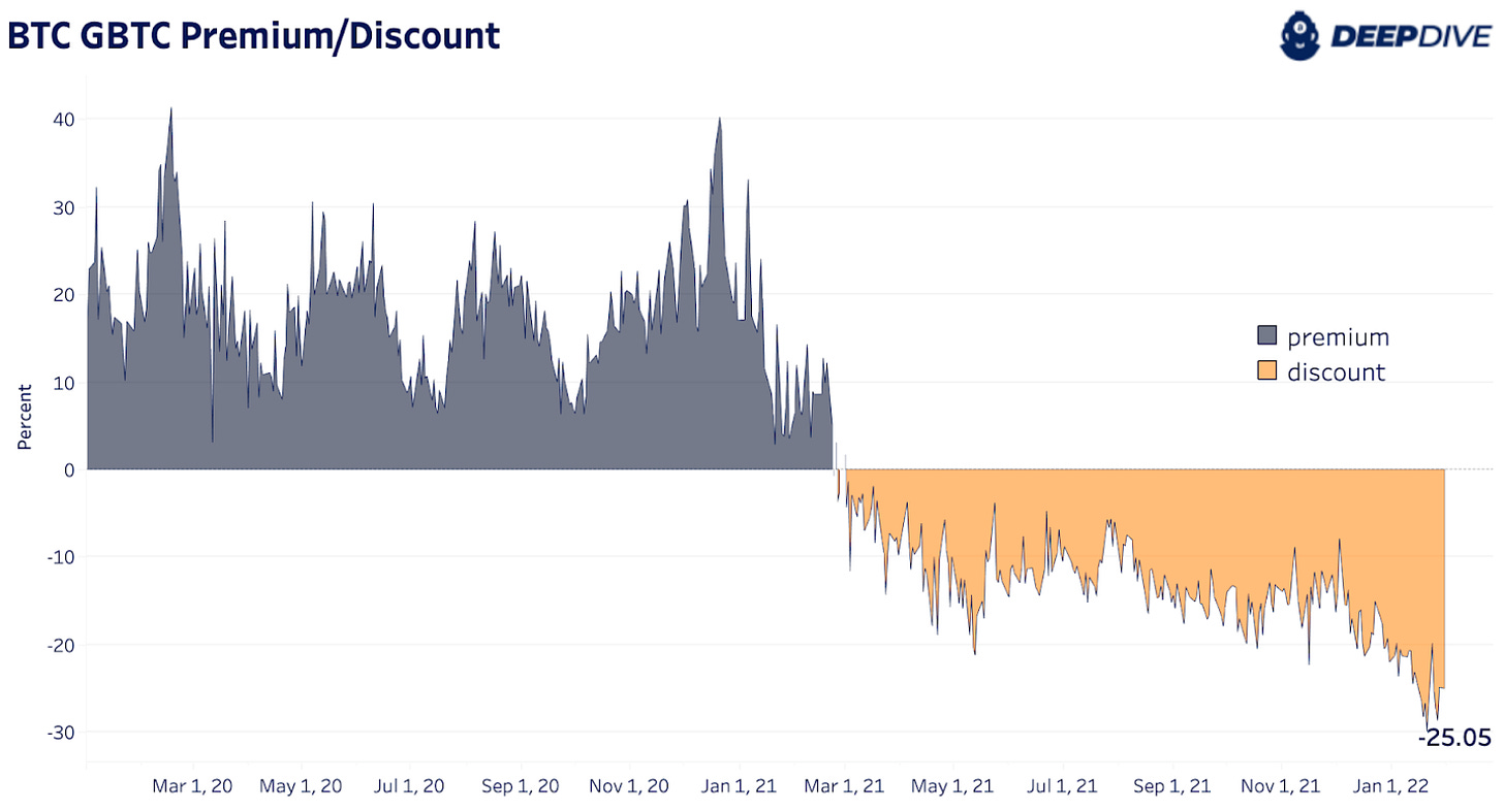 One way you can see this is by watching the discount on the Greyscale Bitcoin Trust (GBTC), which we’ve talked about many times before going back as far as the very first issue. GBTC is a kind of trad-fi wrapper around Bitcoin for institutions who want exposure but don’t want to actually own Bitcoin — so the premium (or discount) is a kind of proxy for how eagerly those institutions are stepping on each other trying to get in (or out) of the market. Here’s what it looks like these days: