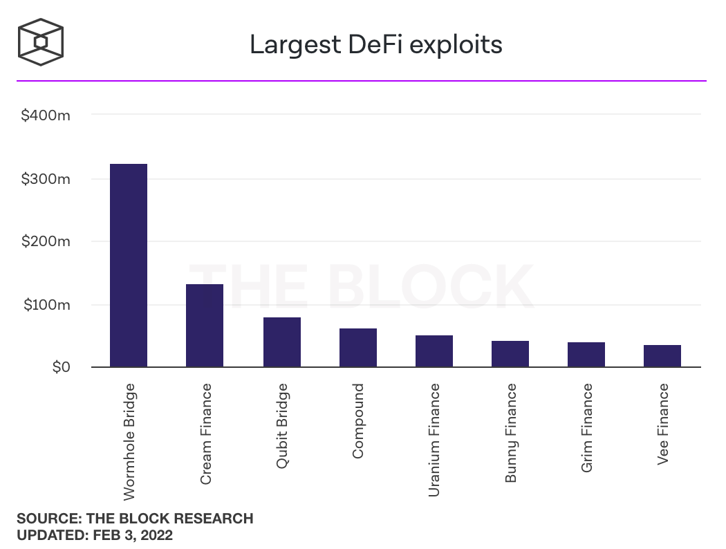An attacker on last Wednesday drained ~120k ETH (~$320M at the time) from the Wormhole vaults, twice as much as was taken in the next largest DeFi exploit. Wormhole is a bridging service for allowing you to use one chain’s token (in this case, Ethereum) on another chain (in this case Solana). You deposit your ETH with Wormhole on the ETH blockchain and they give you wETH1 to use as collateral in various Solana DeFi applications.