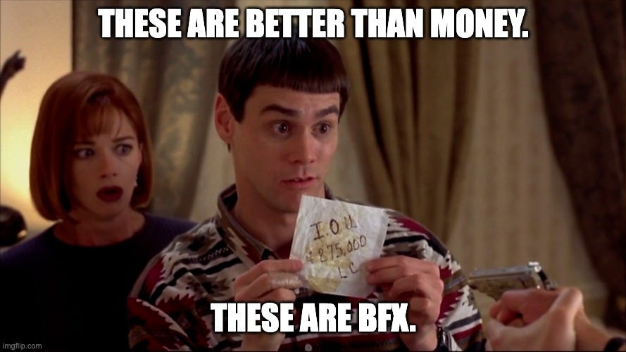 In any case, as an apology Bitfinex gave everyone they stole borrowed money from a new token called BFX which they pinky-promised to pay back eventually. It’s a bit technical but here is a diagram of how the system worked: