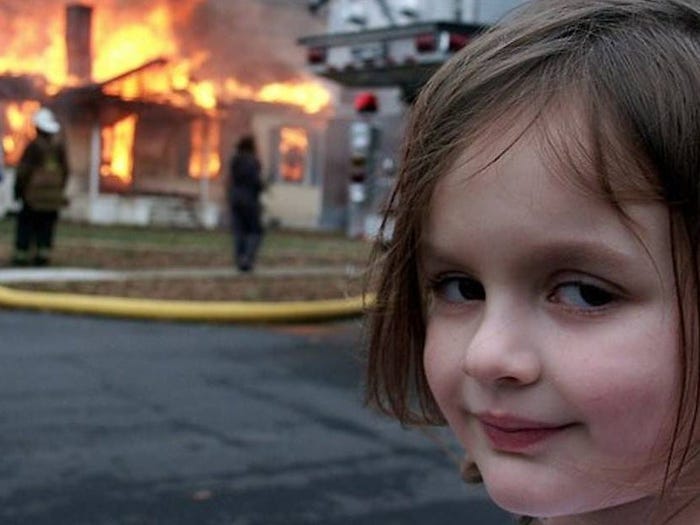In 2005 in North Carolina then four-year-old Zoe Roth stepped out of her home with her father to watch a neighborhood home ablaze. As her father took photos Zoe turned back and gave him a mysterious, Mona-Lisa-esque smile. Thus Disaster Girl - one of the earliest viral meme images - was born. Seventeen years later (i.e. earlier this week) an NFT representing Disaster Girl sold for 180 ETH (~$0.5M).