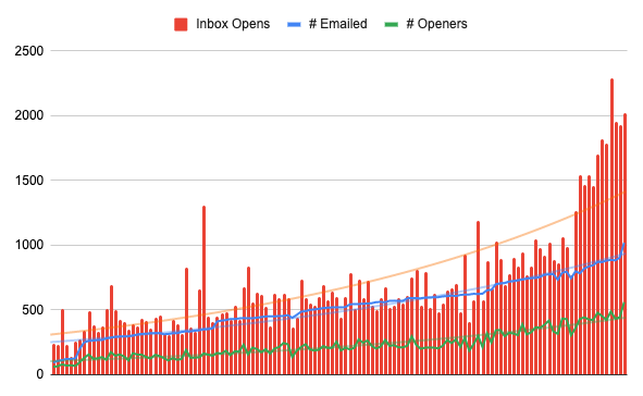 "Your chart confuses me. You said the newsletter goes out to >1k people but it seems like you are emailing <1k and somehow it is being opened by more?” — MF