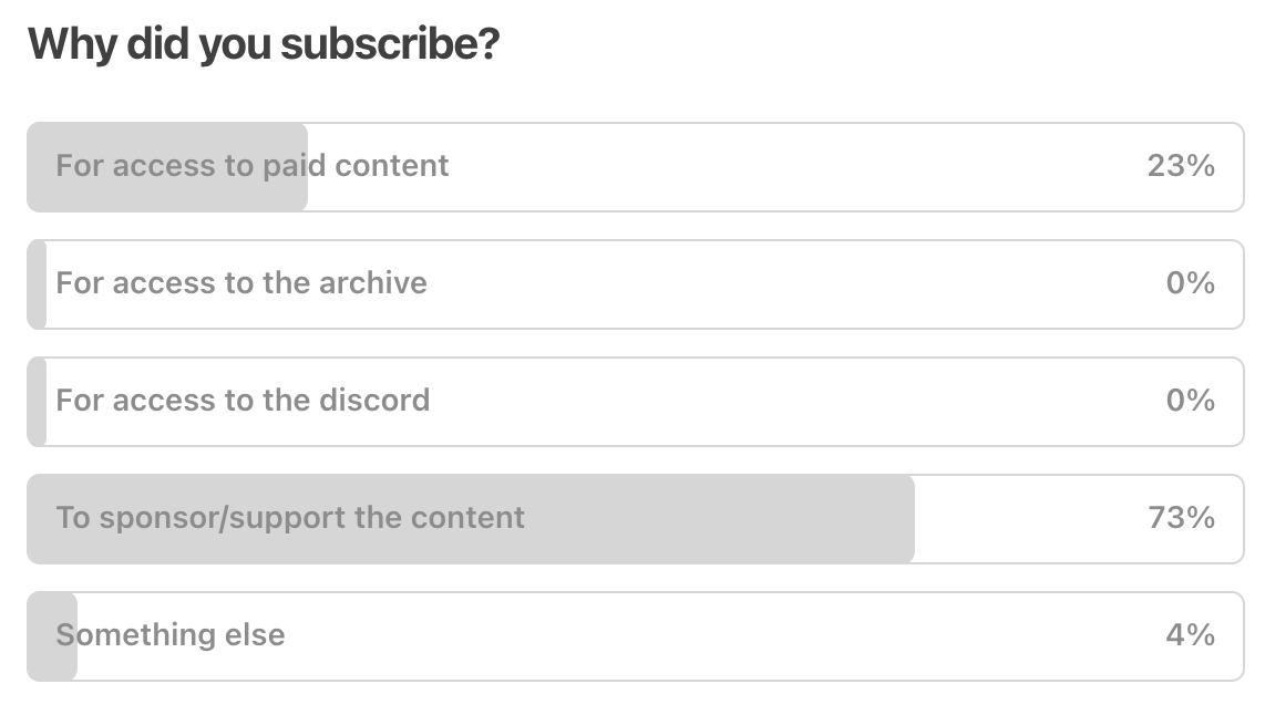 First off I asked them why they subscribed — and found there were two clear motivations that represented everyone who responded. Some were seeking access to paid content, but most (~73%) were seeking to sponsor the content.