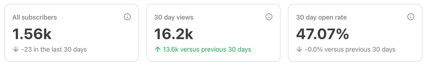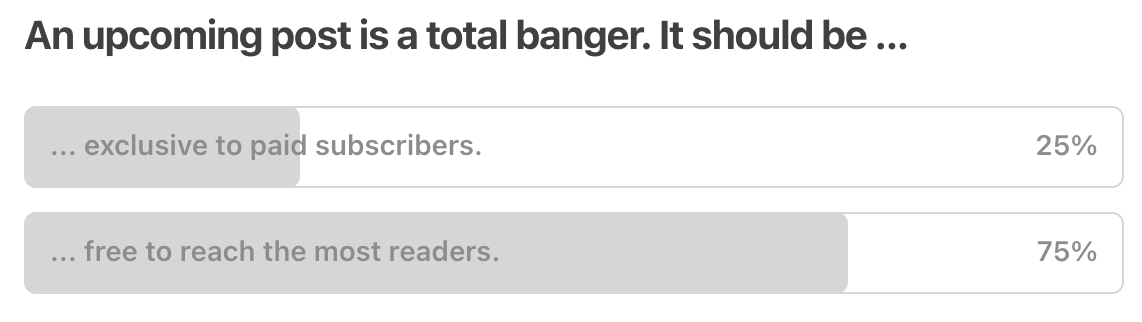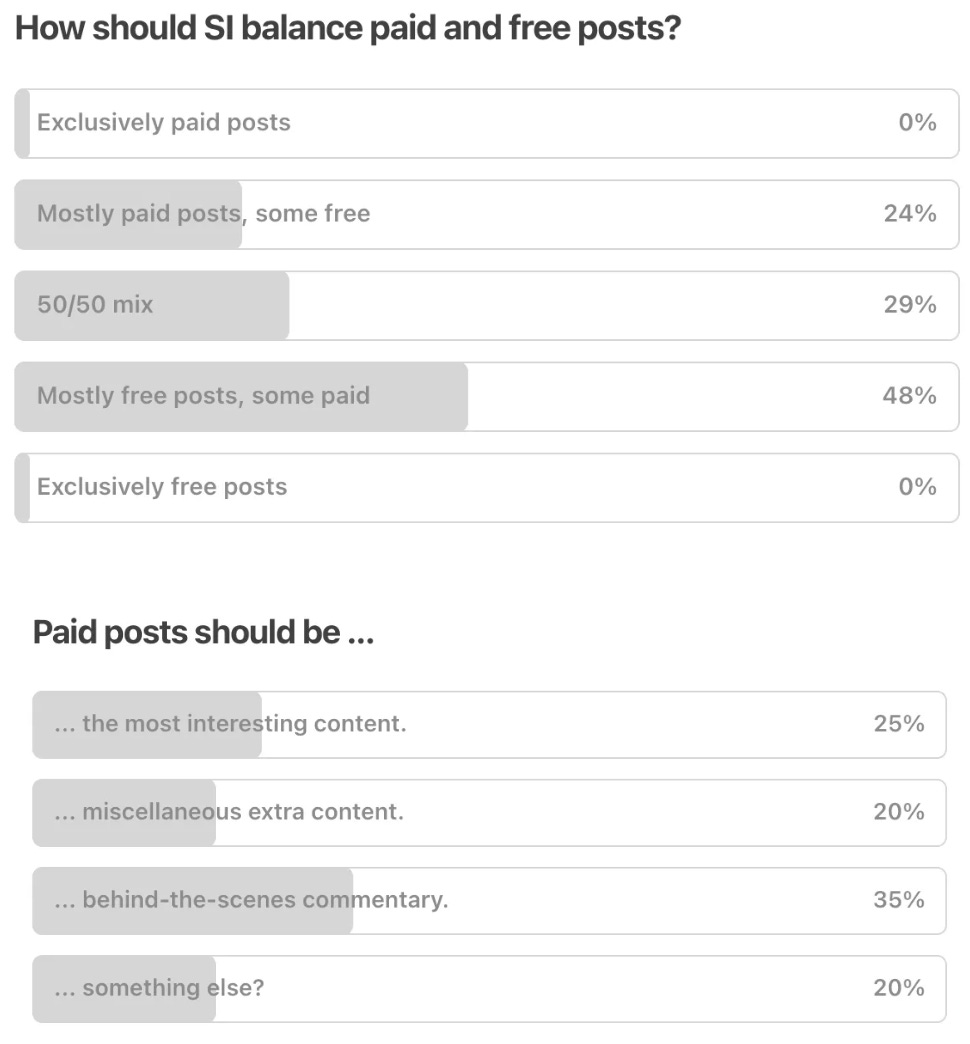 Paid subscribers do absolutely still want some exclusive content, though it’s not clear exactly what content they think is most interesting to paywall. General consensus seems to be a blend of paid and free posts with free posts being more common but paid posts being interesting in some other way. Not immediately sure what that means for Something Interesting but I will mull on it. I’d also welcome any thoughts or suggestions from readers!