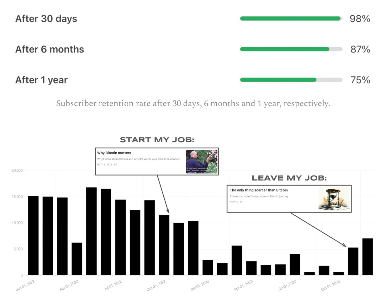 I finished up the year with an op-ed in Bitcoin Magazine, Free as in Freedom is not Free as in Beer. That got quite a bit of visibility (@BitcoinMagazine has 3M followers) but it didn’t translate into much downstream traction — the vast majority of my readership all comes from direct word-of-mouth. Around ~40% of new subscriptions come from substack and ~16% come from Twitter. ~33% or so come from people who clicked a direct link a friend sent them.