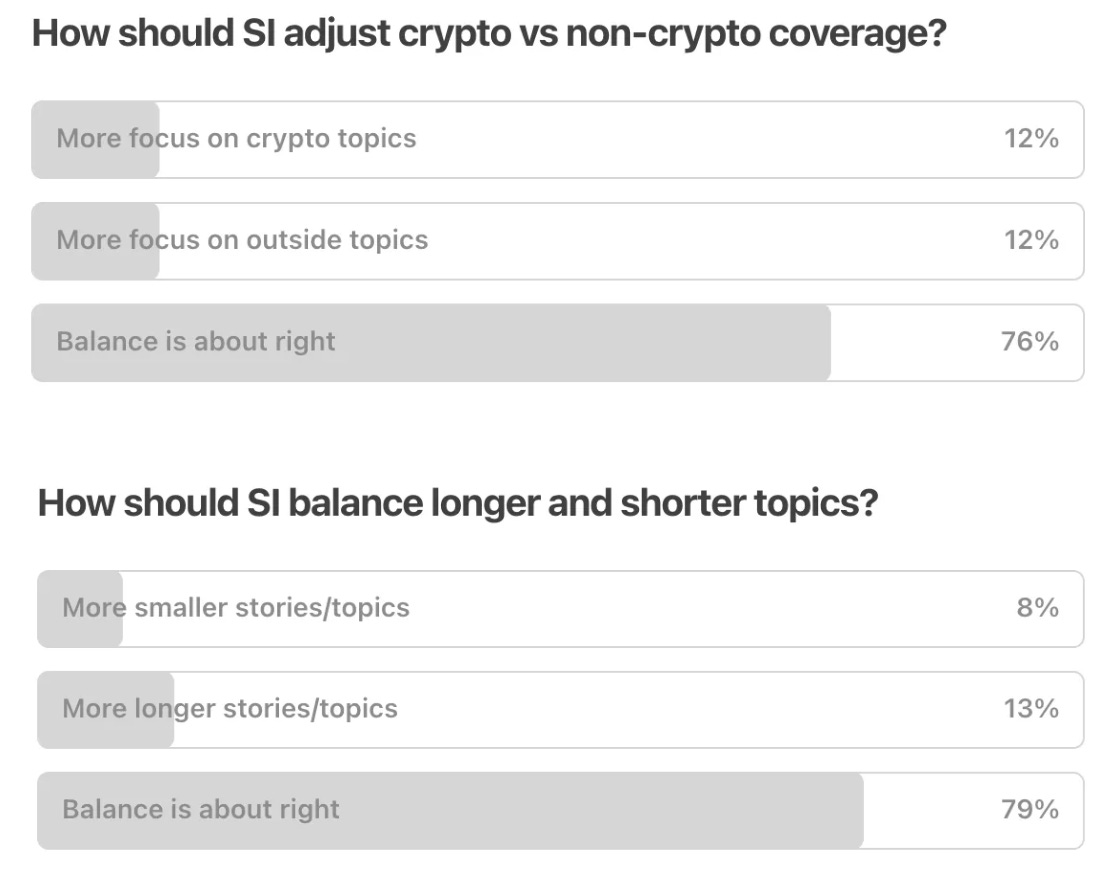 It’s been around a month and a half since I left Blockstream and re-dedicated myself to the newsletter so I’m still figuring out what form things should take going forward. As part of that process of exploration I asked paid subscribers what they wanted to see out of Something Interesting going forward — here is what they said.