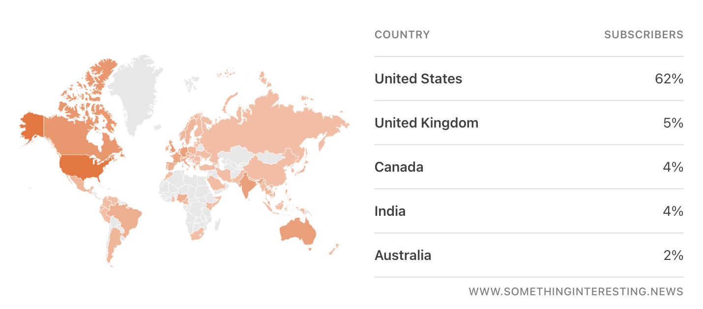 Something Interesting is read by ~1.56k people across 44 states and 77 countries. That’s essentially flat since the last state of the newsletter in December of 2022, which would make sense for a year that I wrote much less frequently. But it wasn’t as uneventful as flat growth makes it sound — my two most controversial posts ever (A Bitcoiner’s Guide to CryptoPunks and The Cult of Bitcoin Culture) each caused ~1-2% attrition from my subscriber base. Fortunately a signal boost from Jameson Lopp and some others on Twitter helped me reach a new audience.
