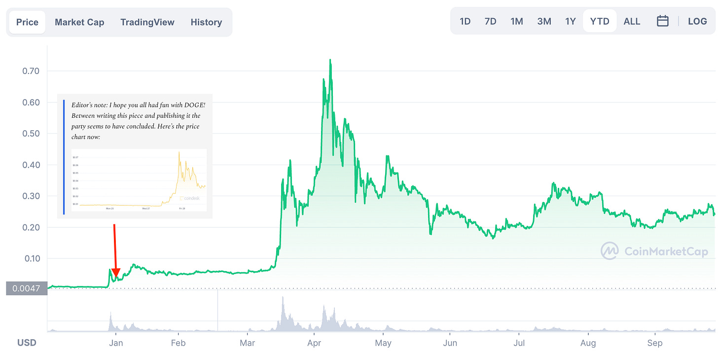 The very first time I wrote about Dogecoin (in January) I concluded with a note saying "I hope you all had fun with DOGE! Between writing this piece and publishing it the party seems to have concluded" and then followed it with a price chart.
