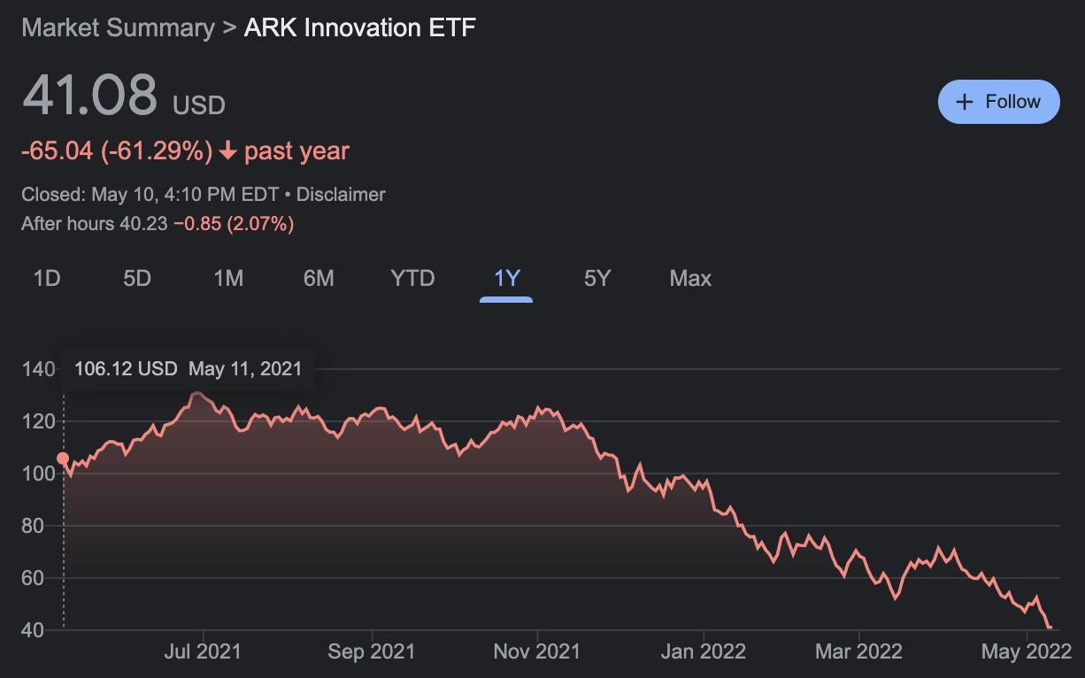 More generally though this is not a good time to be performing like a tech stock. The Fed is fairly openly talking about taming inflation by reducing demand — which is fancy econospeak for deliberately causing a recession to keep prices down. That’s likely to be hard on all kinds of asset prices, especially high-risk, high-return investments generally. Here is the last year’s performance for the ARK Innovation ETF, Cathie Wood’s disruption-focused managed fund: