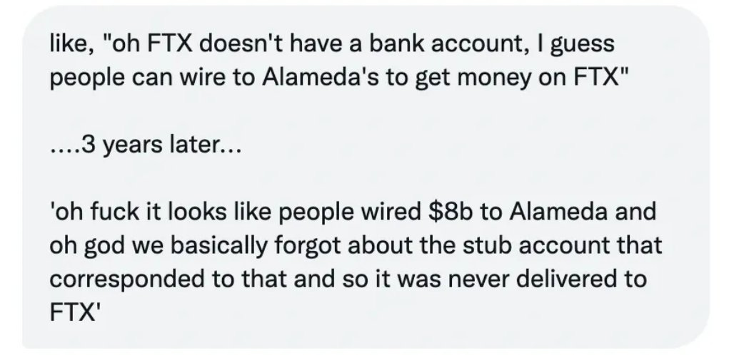 The main crime that SBF crimed is probably wire fraud, which is (loosely speaking) using electronic or physical mail as part of an enterprise that is knowingly deceitful or illegal.1 In this case he told FTX customers their assets were safe when he was actually sending them to Alameda to gamble with. That’s why he is so invested in the idea that this was all a big mistake: you can’t usually do wire fraud by accident.2