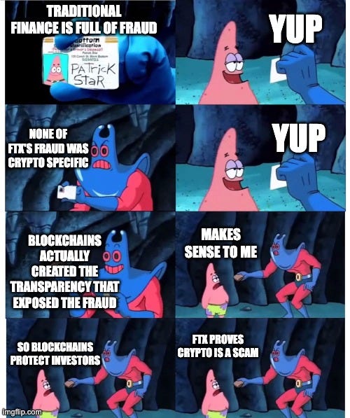 The reason the FTX/Alameda ponzi grew as large as it did is not because crypto is naturally shady but because the SEC and other regulators effectively blocked less shady companies from participating at all. If we need a supplemental antagonist to round out the SBF story arc I think the obvious candidate is SEC Chair Gary Gensler who claims that the collapse of FTX validates his skepticism when in reality he created the void that FTX emerged to fill and was also working behind the scenes to provide regulatory loopholes for FTX. Gensler allowed one of the largest frauds in financial history to happen right in front of him because he was too busy prosecuting Kardashians and sneaking bad faith precedent into minor court cases.