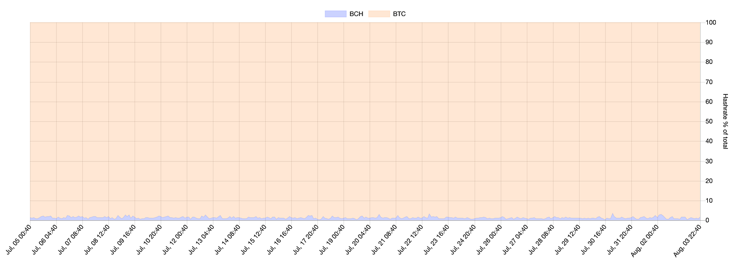 This is the distribution of mining hashpower among various forks of Bitcoin. The strip of blue along the bottom is BCH, which ranges from ~1-2% of total hashpower. If BSV were on the chart it would represent ~0.25% of total hashpower.