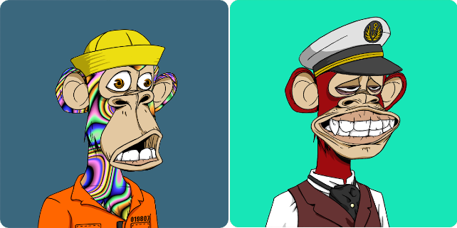 Christie’s announced they will be auctioning a set of Bored Ape Yacht Club NFTs this September with details to be announced this Friday. The floor on BAYCs jumped from roughly ~8 ETH (~$19k) to ~14 ETH (~$35k) in response to the news. Below is a picture of a modest starter ape (~12.65 ETH, ~$31k) and an expensive aspirational ape (~1,368 ETH, ~$3.4M). I leave it to you to decide which is which.
