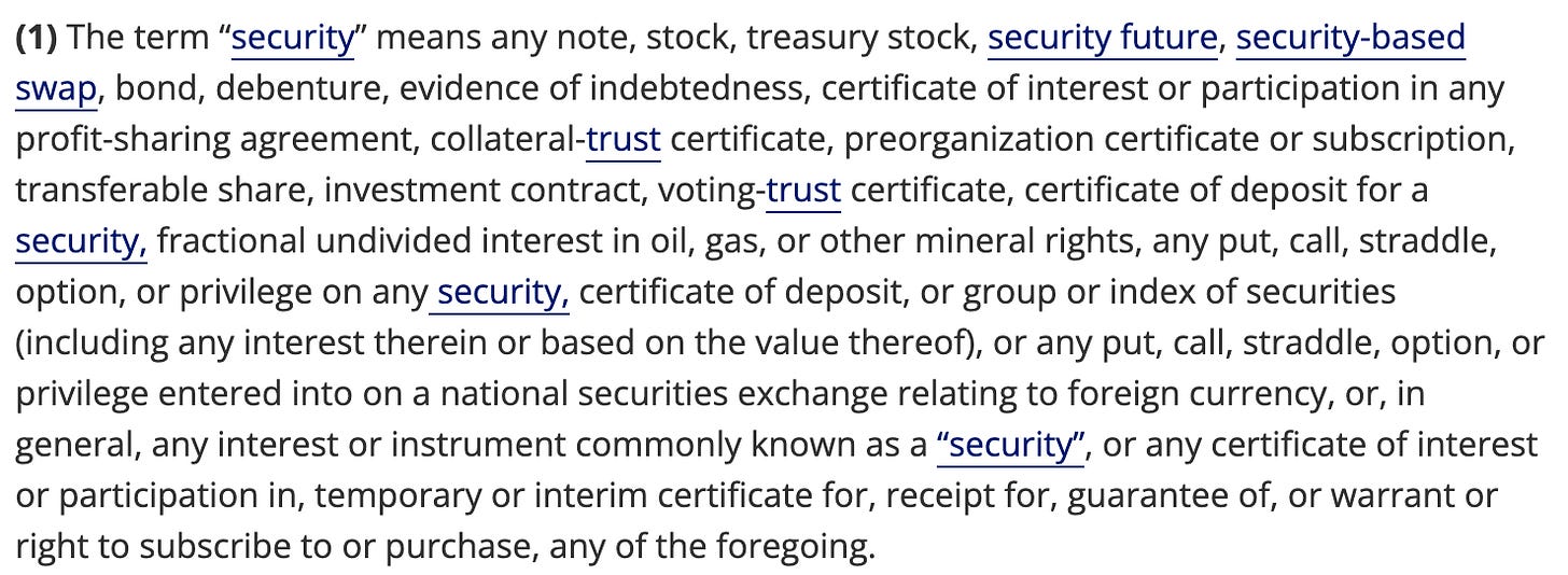 To understand why Judge Torres ruled that XRP is not a security we’ll need to unpack at least a little about what a security is2 — which is going to make the last post about the metaphysics of artistic value look straightforward and sensible by comparison. First off, the word 'security' is a legal catch-all term designed to encompass basically any financial instrument. You don’t actually have to read this whole list, just let it wash over you: