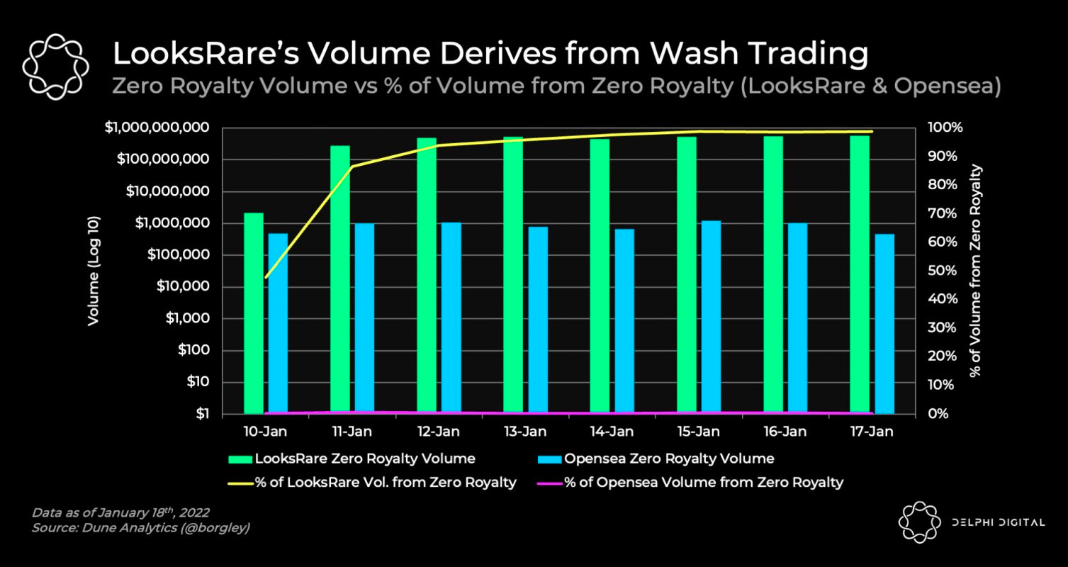 The graph at the top of this section is Goodhart’s law in action: LooksRare is paying people to trade on their platform and so people are trading … with themselves. Some have argued that this wash-trading is good for the platform because it creates fees for users who are staking their LOOKS, but I don’t buy it. You could subsidize stakers directly without giving the wash traders a cut. In my opinion this particular incentive system is broken and being exploited. LooksRare is buying dead cobras.