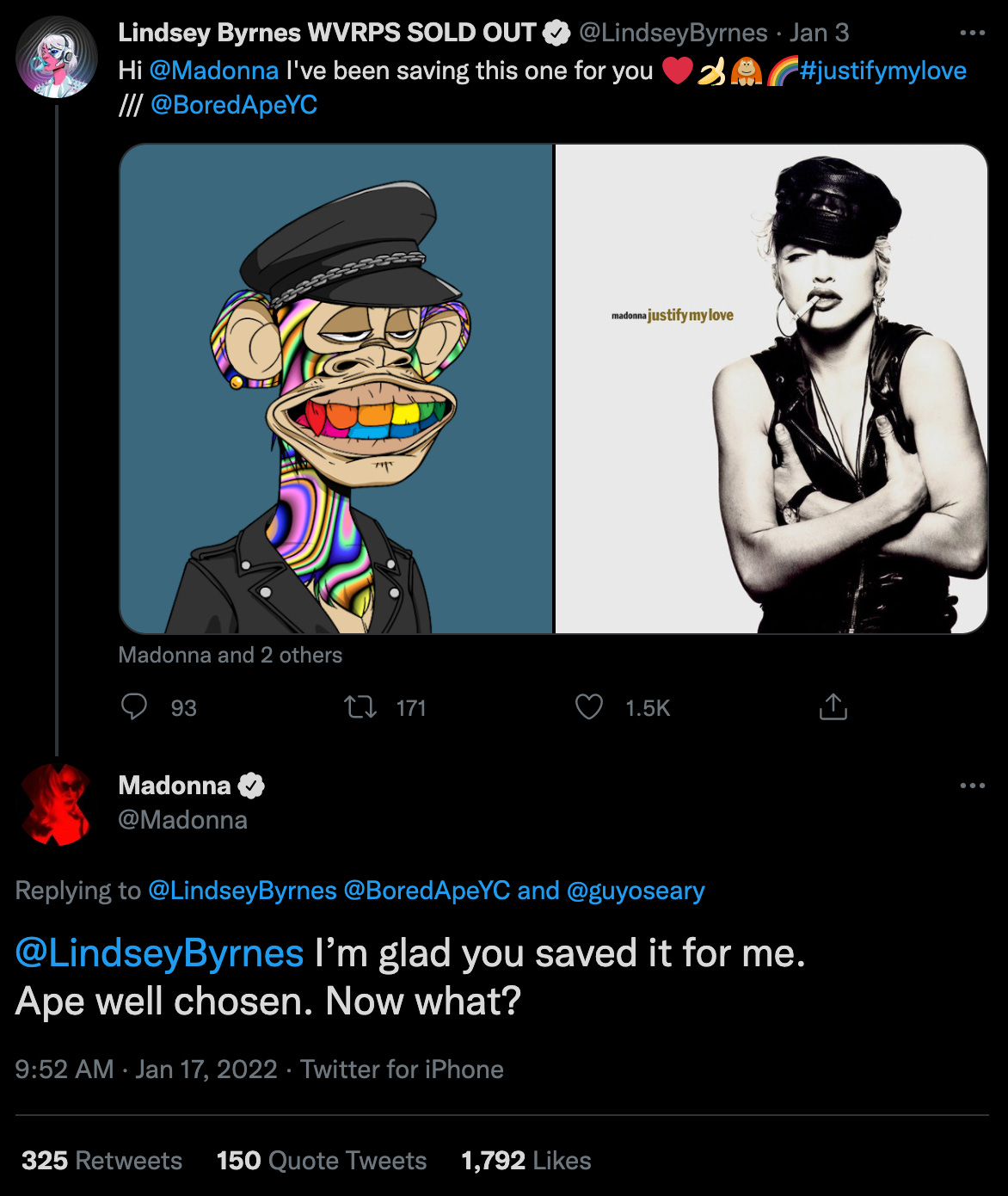 In a footnote a few issues ago we mentioned a trend of matching Bored Apes to potential celebrity owners, including an example of a particularly apt one for Madonna. Turns out Madonna agrees: