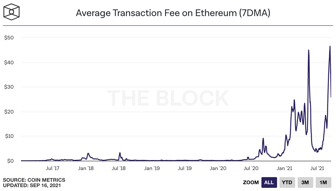 The most visible complaint that Ethereum’s customers have with the network (and hence the obvious target of most competitors) is how expensive it is to use the network - generally referred to as gas fees. At time of writing the 7 day average cost of a transaction on Ethereum is ~0.0074 ETH (~$25.6/transaction). Larger more complicated transactions like the ones used by dApps can easily cost ~20-40x more gas than a typical transaction.