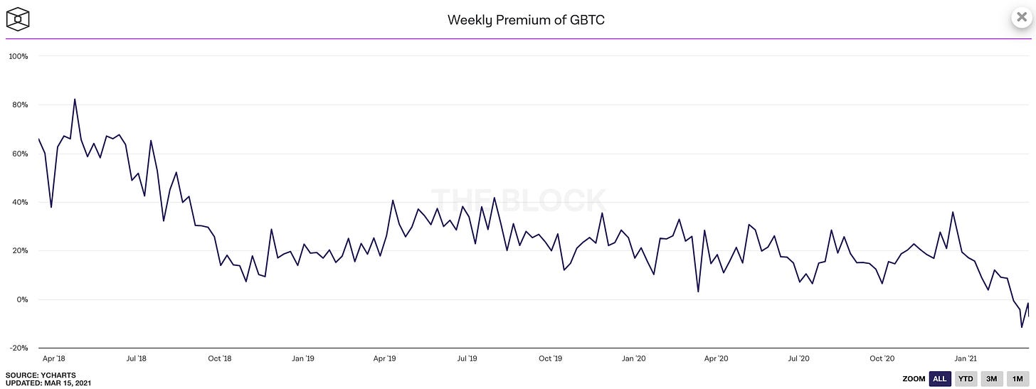 Recently, that premium has largely evaporated and even dropped below zero, meaning that it is now cheaper to buy GBTC than to buy actual Bitcoin.