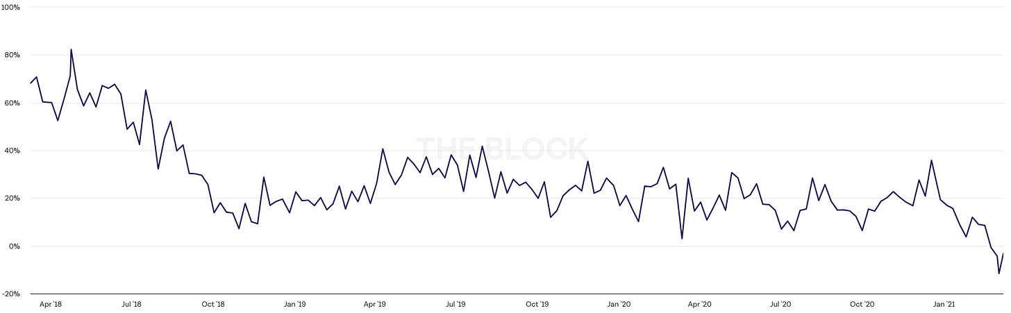 Grayscale is the company behind GBTC, a Bitcoin investment fund that was (until recently) one of the only ways for institutions to get exposure to Bitcoin without having to hold Bitcoin directly. As a result a lot of institutions were willing to pay a premium for shares of GBTC because they had no other options. Towards the end of January we talked about how that premium was likely going away.