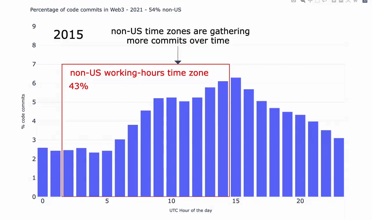 Here is an interesting set of analyses making the argument that the web3 developer community is uniquely global and growing less US-based over time. That is distinctly different from other open-source projects like Go or Linux, which are both heavily US based and relatively stable over time.