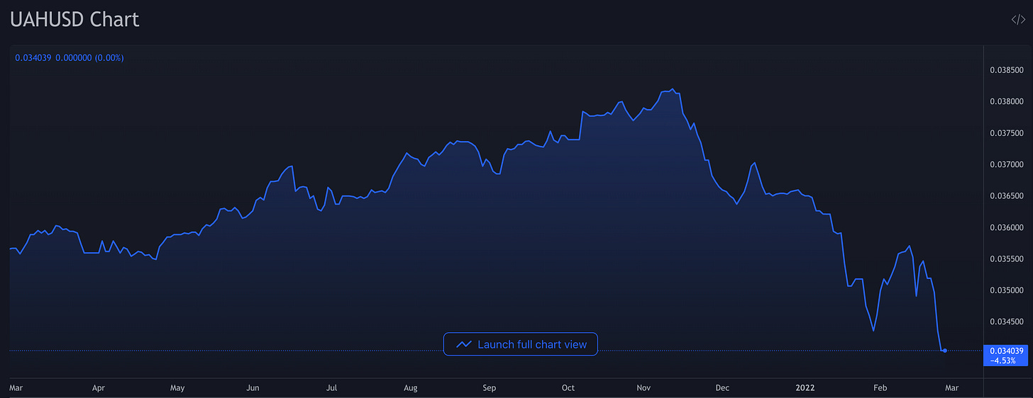 In theory Bitcoin aspires to be digital gold, the ultimate safe-haven asset. It can store and transmit value even in a war zone and might be a useful tool for people hoping to raise funds internationally or preserve their wealth through a possible currency collapse. The Ukrainian Hryvnia is down ~9% against the USD since Russia began amassing troops on the border in November.