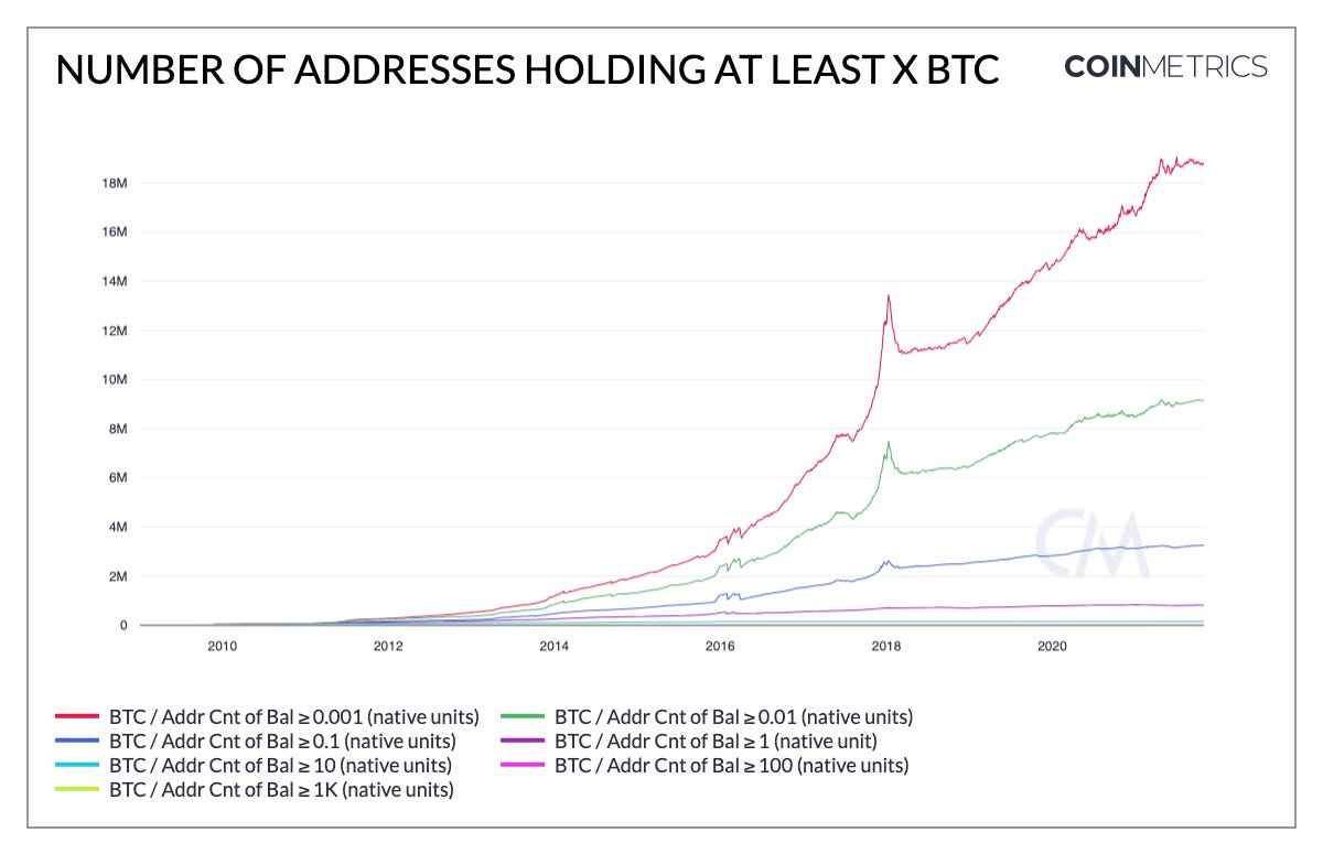 The concentration results they show are alarming but I’d be interested in seeing a version of the miner analysis over time - my sense is that Bitcoin mining operations are probably similar to everything else on the Bitcoin network: relatively few players at first but steadily increasing number of actors over time. Here’s how that looks for how concentration in ownership of Bitcoin has changed over time:
