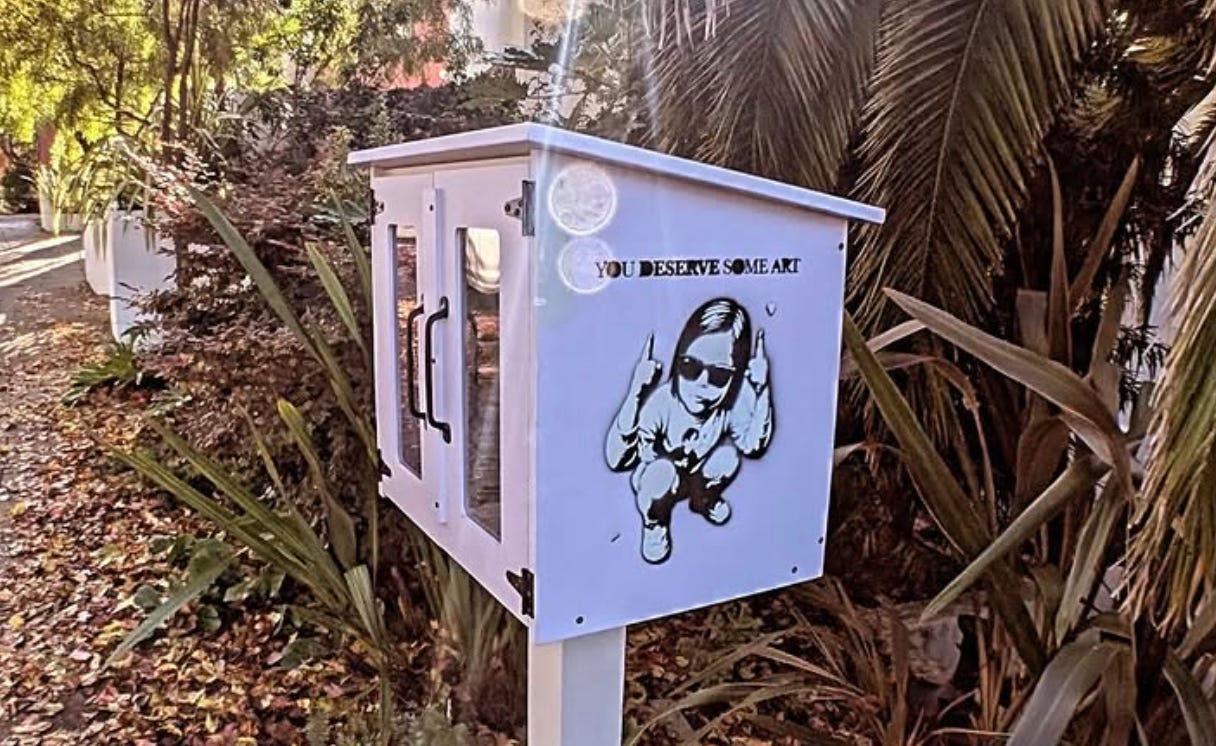 The photo of the artbox is interesting because it is minimal. Using ChatGPT here was basically a convenience step. It’s completely viable to go directly from digital photograph to Adobe Illustrator and the result would not look particularly different, it just would have taken more time. ChatGPT was a relatively minor contributor to the stencil and the stencil is itself a relatively minor component of the final image. To me, labeling a photo of the artbox "made with AI" is almost as reductive and silly as treating every digital photograph as "made with AI."