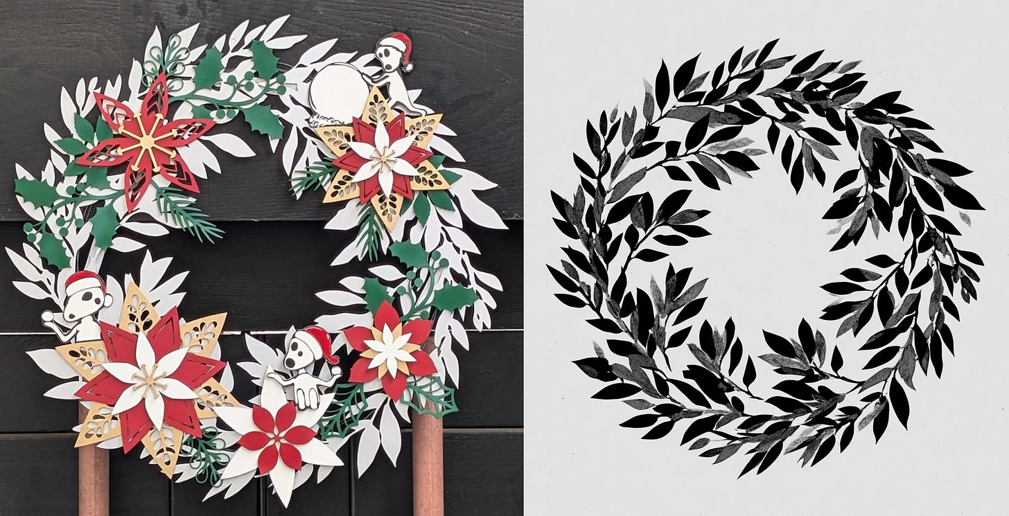 We designed the flowers (and the green leaves) using a set of shape stencils we got from Etsy. I drew the kodama myself. We used Midjourney to design the silver background leaves. They’re definitely important to the design (structurally as well as aesthetically) but it seems strange at best to describe the image on the left as "AI art" just because the image on the right was one of the component ingredients. I think what people mean by AI art is closer to this: