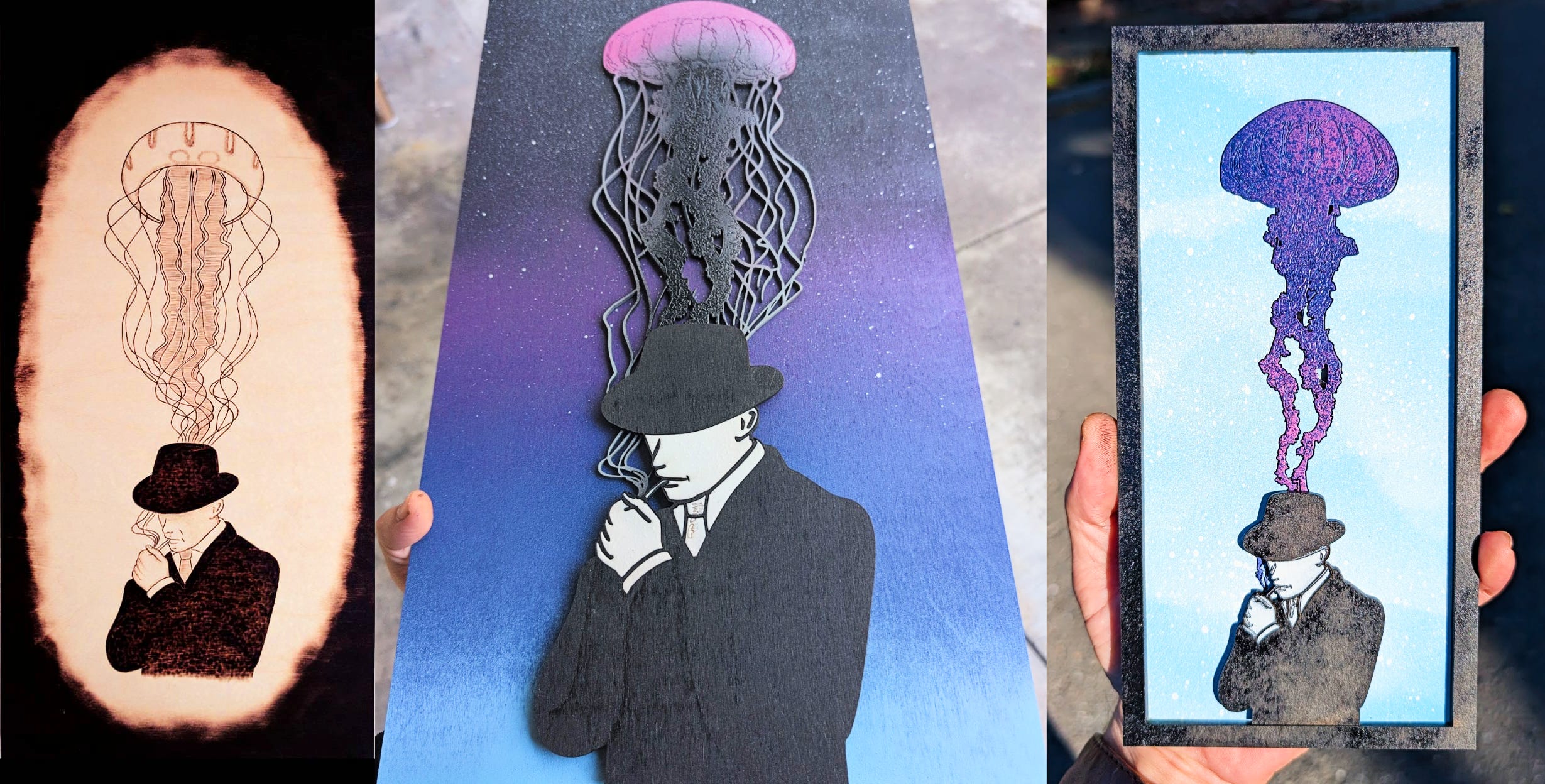 I made the woodburn on the left in 2016 and sold it to a smoke shop in Austin. I drew it by hand in pencil and then burned in the design with a pyrography pen. This year I decided to recreate it. I was never completely satisfied with the original jellyfish, so I used Midjourney to design the exact jellyfish I wanted and then used Illustrator to blend the tendrils of that jellyfish into tendrils of smoke. I cut the pieces out with a laser cutter, spray painted them individually and then reassembled them. That’s the middle version. Then I simplified the design to make a small version (on the right) to give away in the youdeservesome.art box.