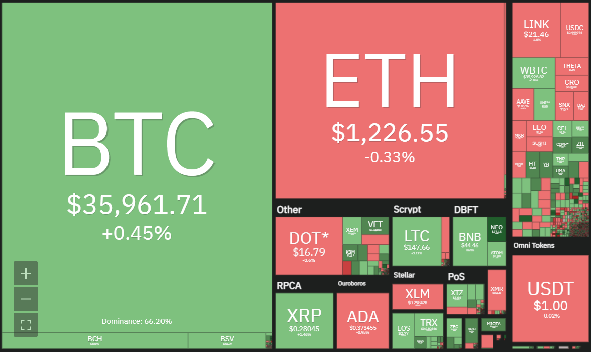 I went into more detail in the last post about it, but I don’t find this fear very convincing. If a casino in Vegas is lying about whether their poker chips are fully backed it doesn’t invalidate the prices of the restaurant next door. Tether is simply not that relevant to the destiny of Bitcoin. For one thing, Tether is a much smaller part of the ecosystem than the above post implies. You can compare their relative market caps in this graphic. BTC is the green square on the left, Tether is the red square in the lower right hand corner: