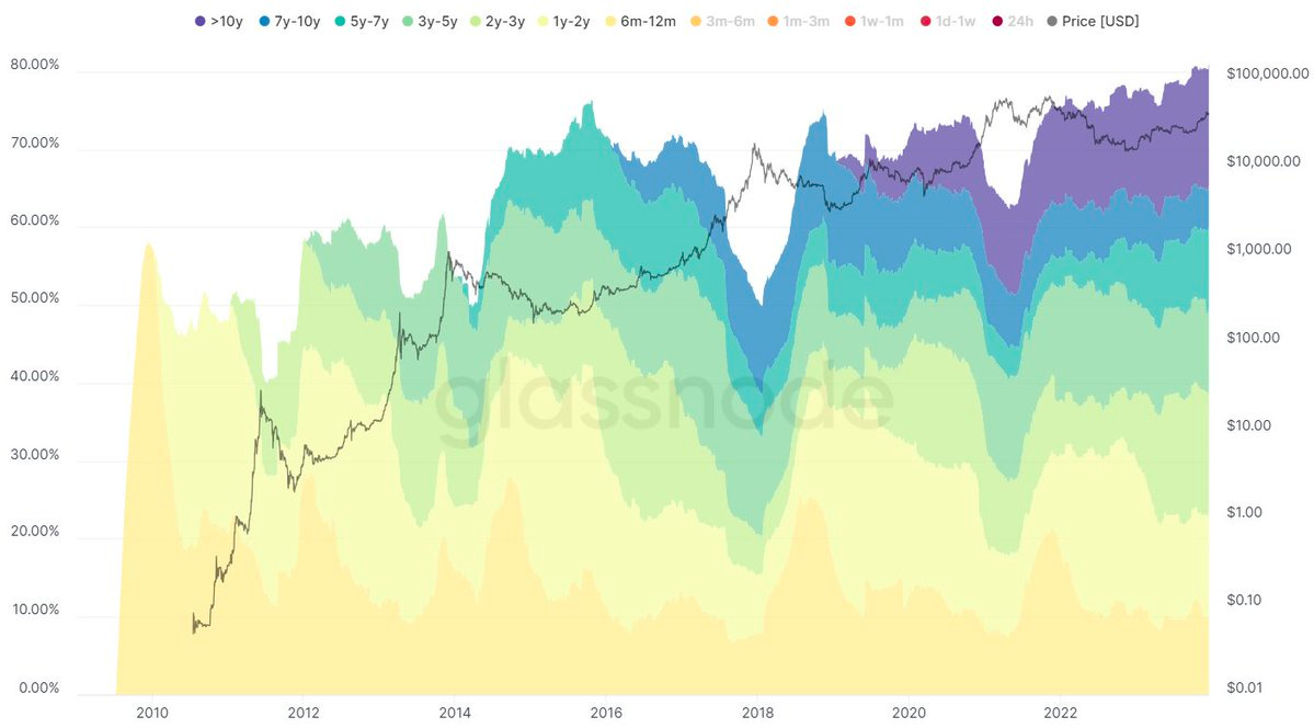 Bitcoin ETFs may also end up creating their own demand by competing with each other — at least three television ads have already been released. More importantly, whatever demand there is will very likely find that the supply of available bitcoin is smaller even than it appears. More than >80% of all bitcoin did not move in the last 6 months even as the price rose from ~$30k to ~$44k. There is no sign that people who have held bitcoin through the long bear market are interested in selling yet.