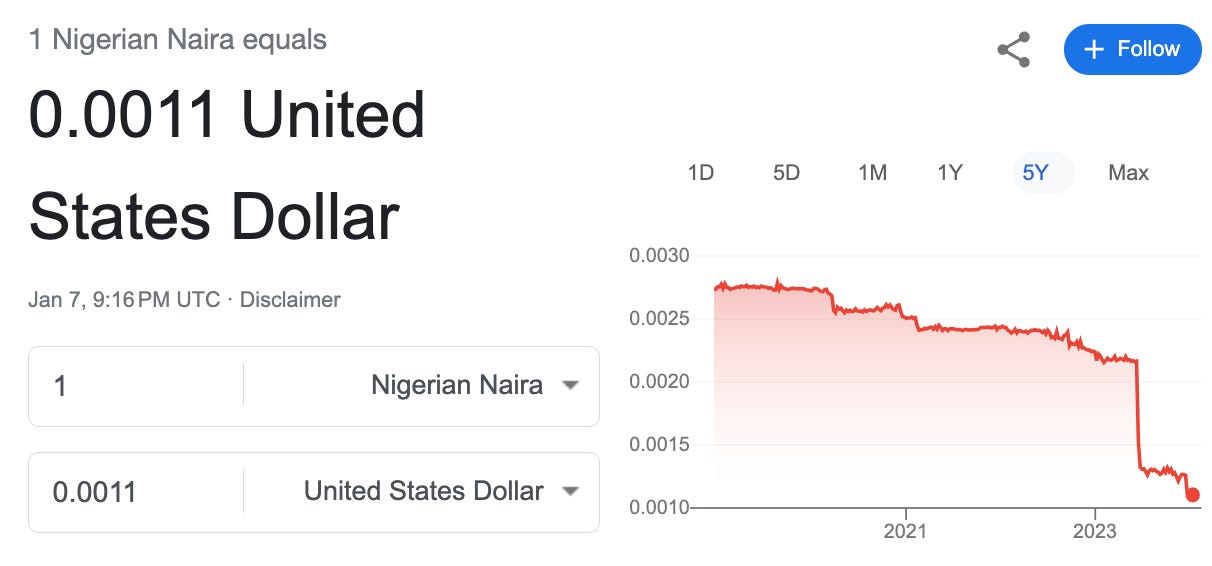 I’ve written before about the Nigerian government’s uneasy relationship with cryptocurrency. Nigeria has the highest self-reported rate of Bitcoin ownership of any country (~20%) in part because the Nigerian Naira has been failing — it has fallen in value by more than 50% since we last mentioned it in 2021.
