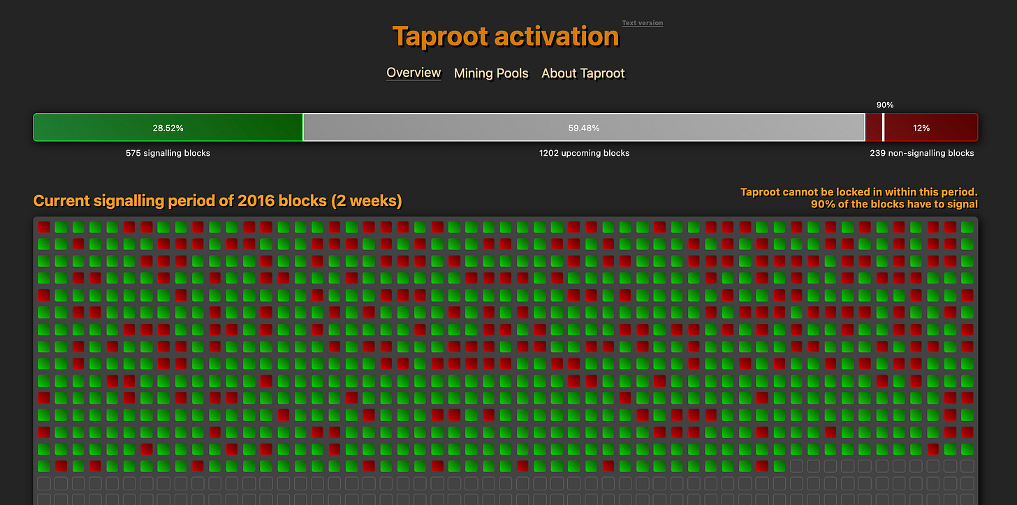We’ve talked a few times about Taproot, the privacy and scalability upgrade that the Bitcoin network is currently attempting to land. At this point mining pools representing a collective ~94% of total hashpower have signalled readiness for the upgrade at least once, though many have only signalled sporadically. Too many unready blocks have happened for the activation to lock in on this difficulty epoch but the trend is clear: