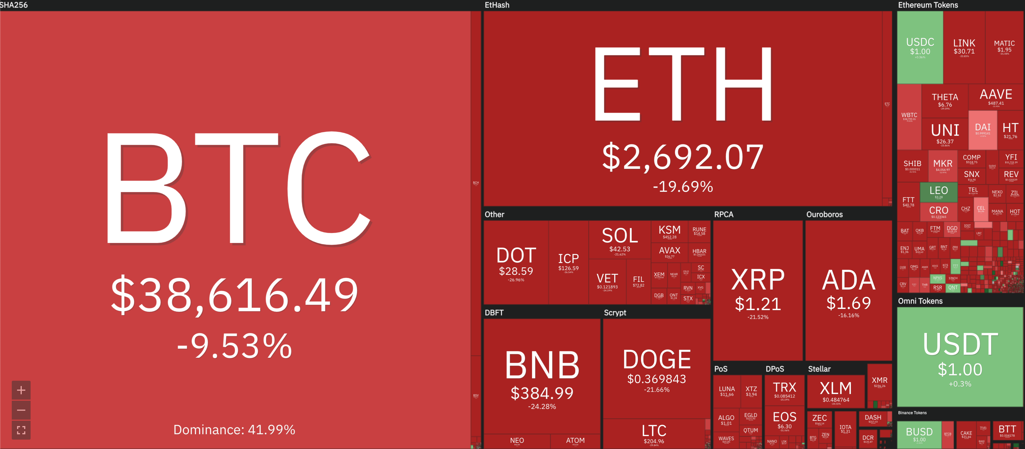 The three largest green squares (USDC, USDT and BUSD) are all stablecoins designed in various ways to be pegged to the dollar. So this particular drop has been a somewhat universal bloodbath. Not even DOGE was spared.