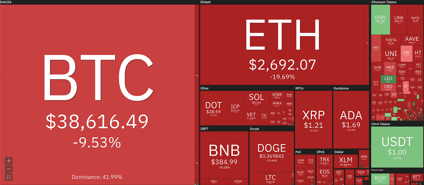Investors are continuing to process their feelings about Elon Musk publicly breaking up with Bitcoin this past weekend. Bitcoin is down ~30% over the course of the week so far, plunging nearly to ~$30k/BTC before recovering to ~$39k/BTC at time of writing. That’s bad news for Bitcoin holders but they were not alone. The entire cryptocurrency market is in freefall.
