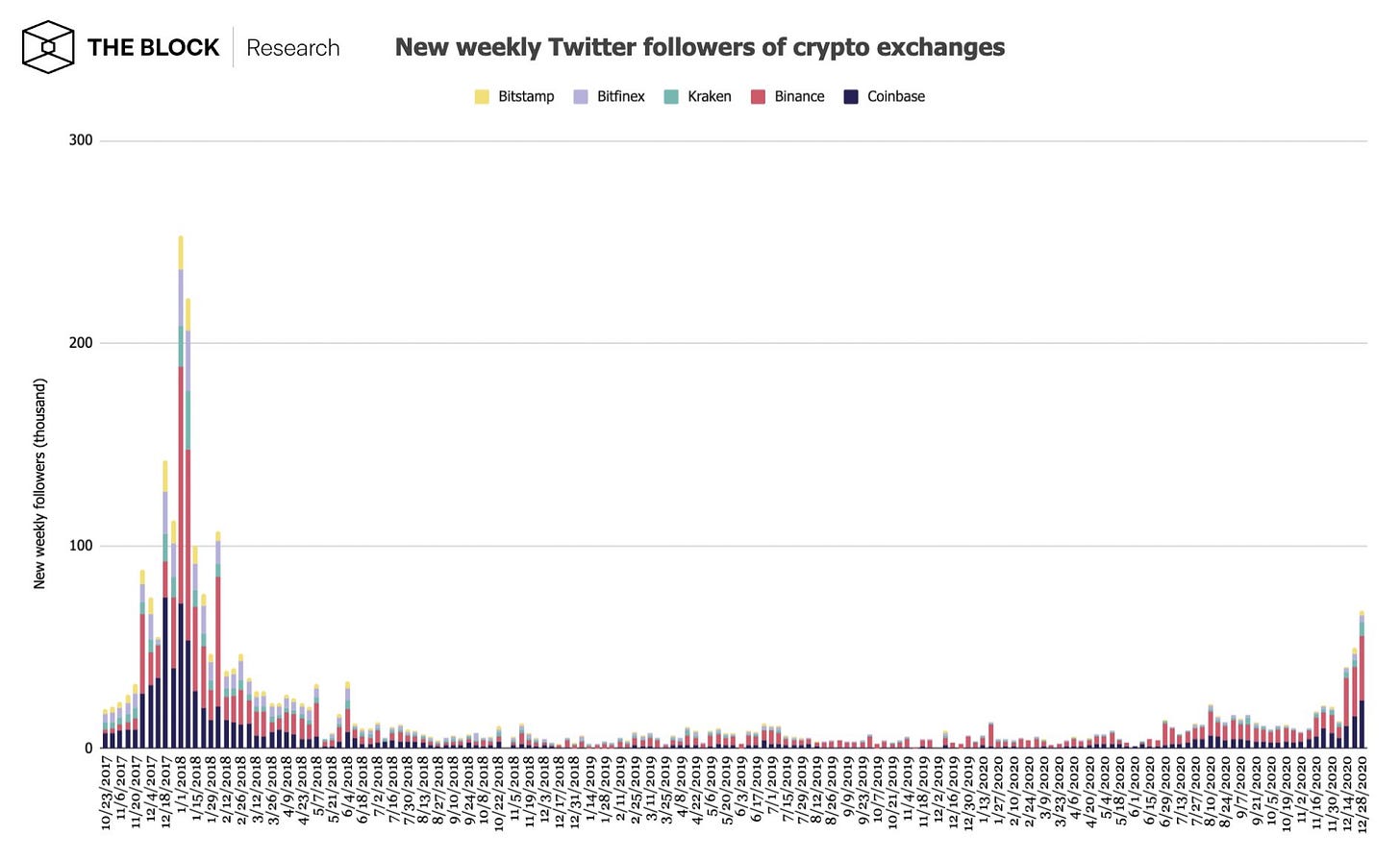 Interest is up but we are clearly not at 2017 levels yet. Another approach is to watch how many people are starting to follow the Twitter accounts of major exchanges. The same pattern shows up there - rising but still nowhere near the peak in 2017. The retail stampede has not yet arrived. Most people aren’t even paying attention.