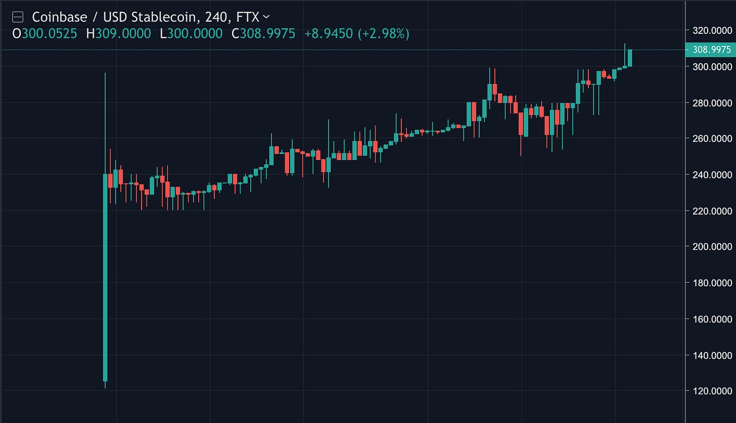 Just before Christmas derivatives exchange FTX launched a futures market for the highly anticipated Coinbase IPO. The market is very small (~$33k/day volume) and not open to US investors, but the investors it is open to are very bullish: