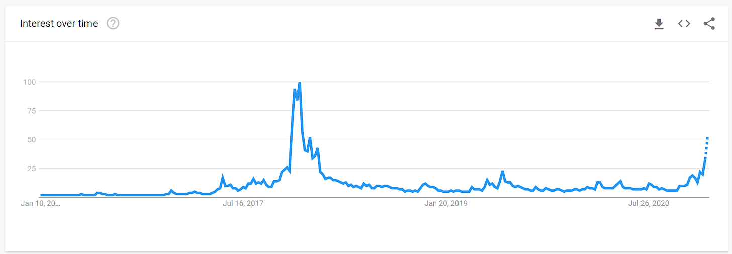 In spite of the indicators above that suggest a pullback, I still think we are relatively early in the bull cycle. One way you can gauge that is by looking for signs that the general public is (or is not) paying attention to Bitcoin. The final stages of a bubble tend to feature a lot of mainstream coverage of the price and a lot of new interest from casual investors (i.e. gamblers). You can see how many people are searching for Bitcoin on Google for example: